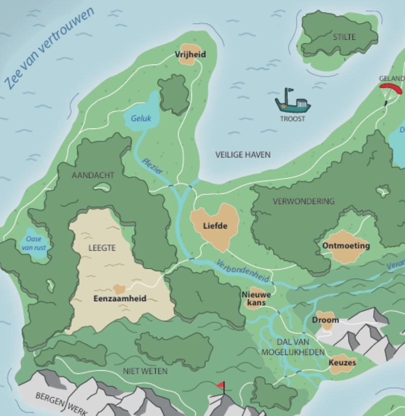 Daarop staan plaatsen als ‘Liefde’, ‘Ontmoeting’ en ‘Hoop’ maar ook ‘Bergen werk’ en ‘Stress’. We zijn benieuwd wat jou bezighoudt! Waar word je blij van, waar maak je je zorgen over? Wat zijn belangrijke waarden in jouw leven? In een gesprek rondom het ‘Land van Zin’ laten we je graag ervaren waar je verlangens liggen en hoe je daar komt!